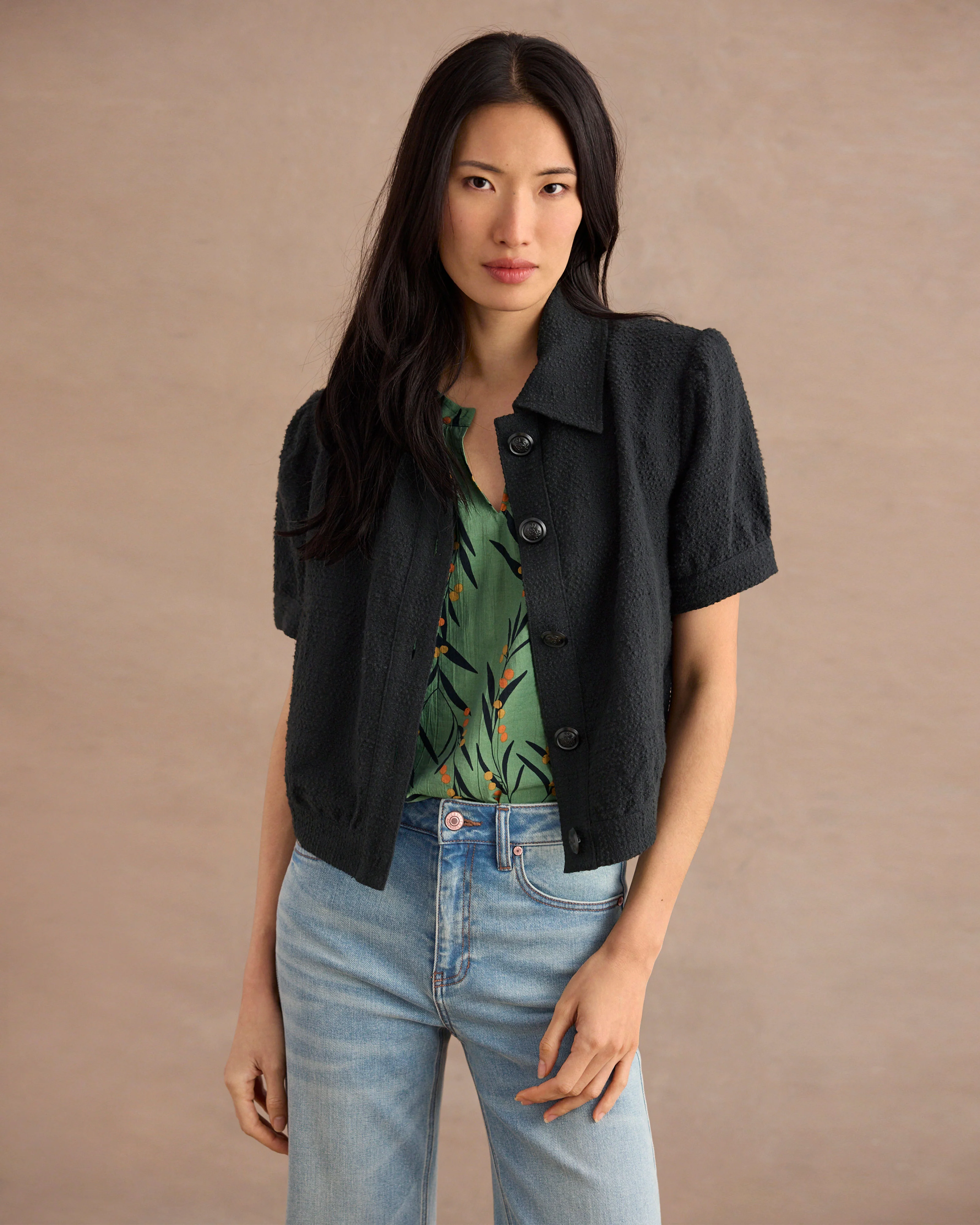 The short sleeve classic bouclé knit Bettina Jacket in black is the perfect piece. Featuring a button-front with novelty medallion buttons and banded at the hem, this jacket also has front pockets and is fully lined with specialty cat print on the inside for a special touch.