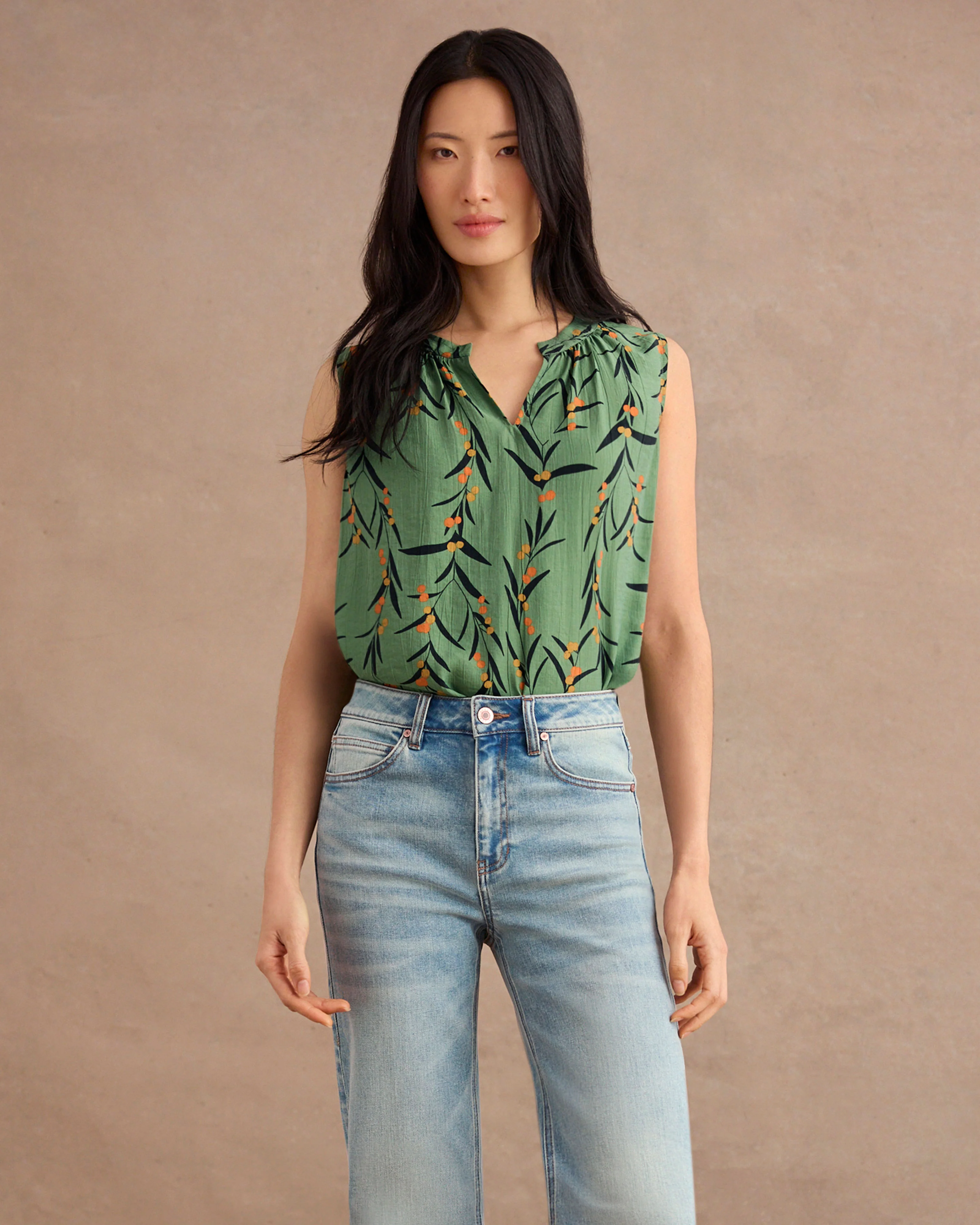 The Claire Top features a vintage-inspired, spring-friendly print that transitions perfectly into the season. A pop of orange brings brightness to the crinkle fabric with slight shirring on lower hem and back for a look that’s breezy and colorfully collected. Shop our green sleeveless top today.