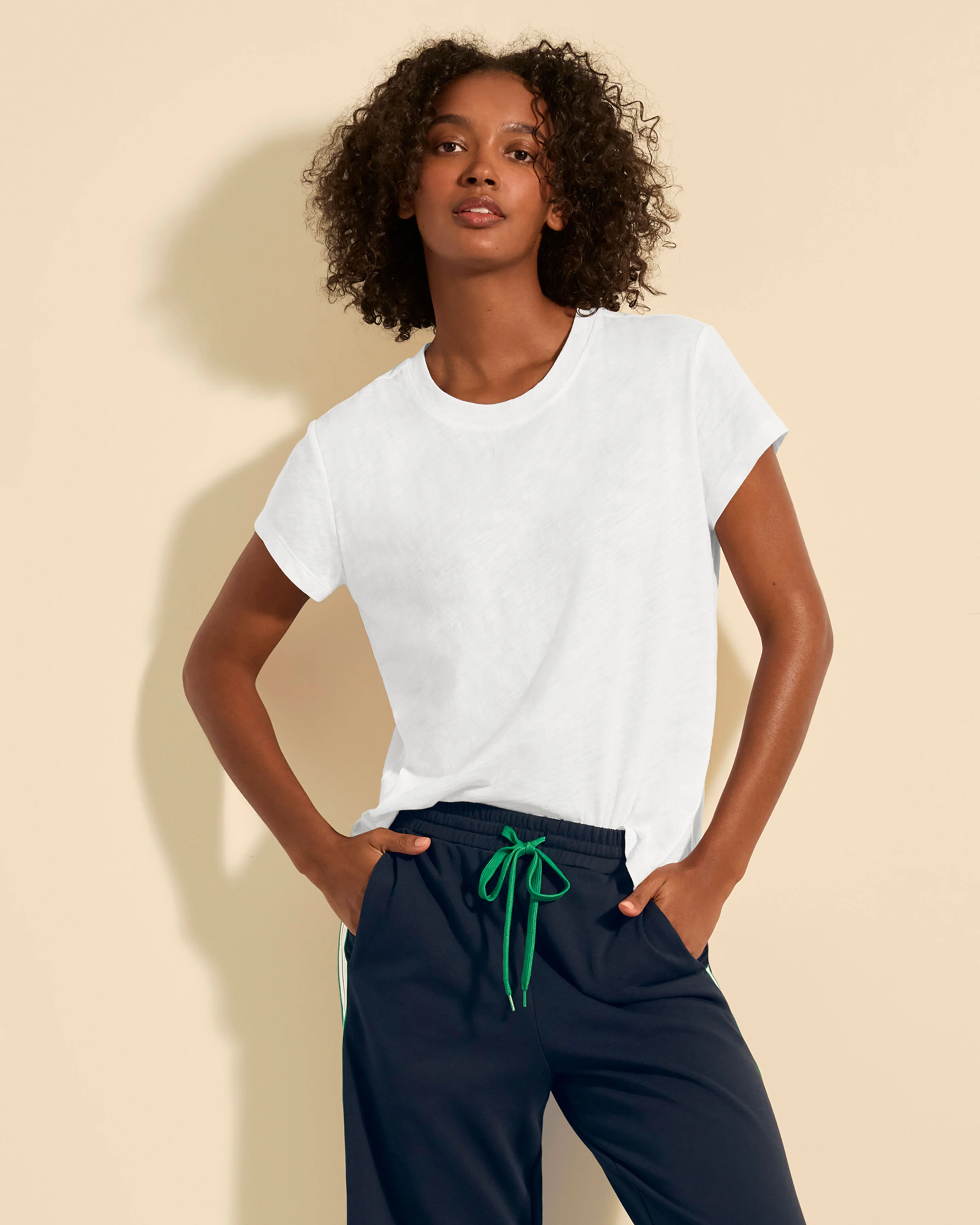 A refined essential for every wardrobe, this white fitted slub-knit tee is crafted from 100% cotton for a soft, luxurious feel. Featuring a classic crew neckline and cap sleeves, it serves as the perfect base layer under blazers or lightweight jackets—or wears effortlessly on its own for an understated look. Shop our women's white crewneck t-shirt today.