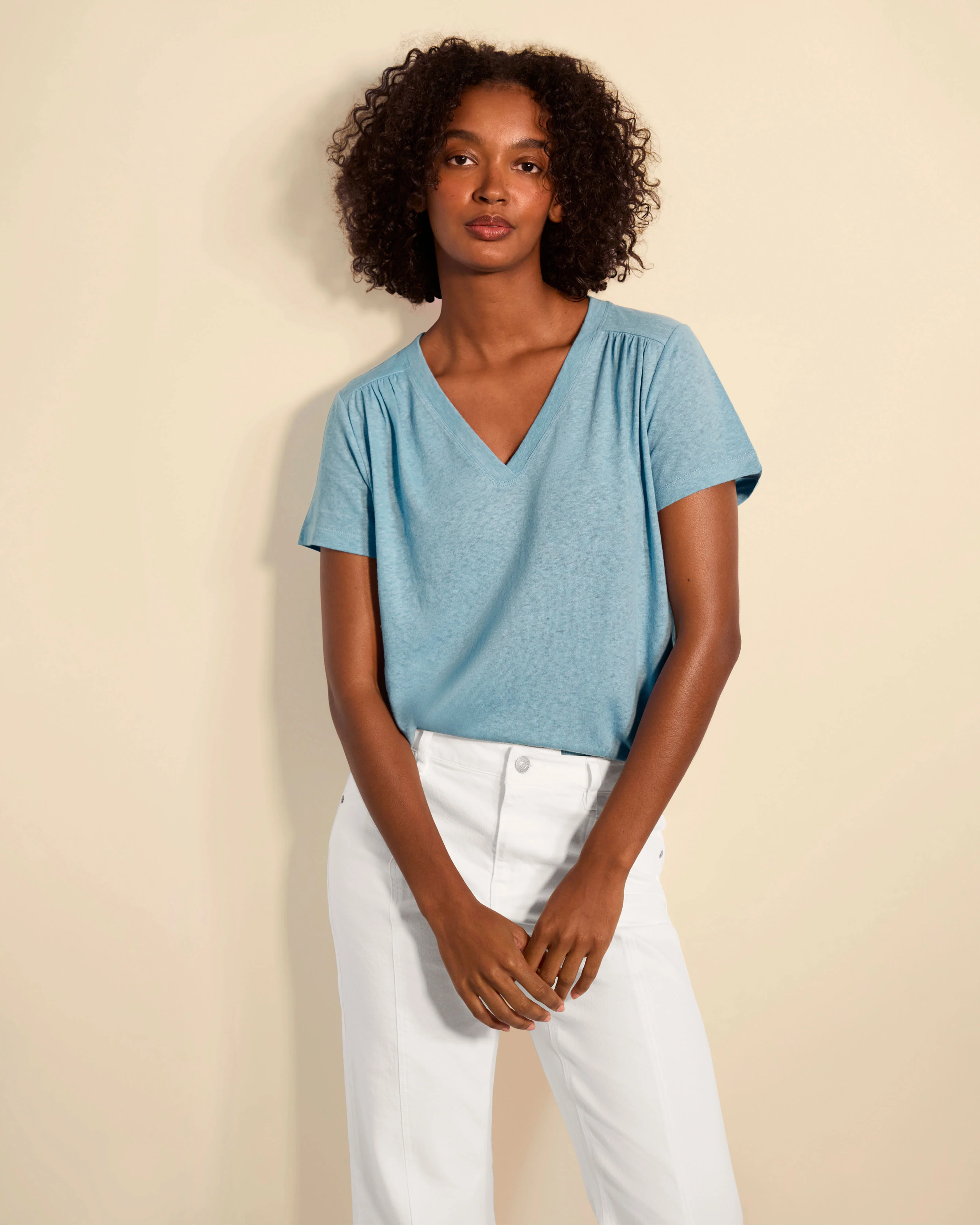 A breezy update to your spring wardrobe, this slub-knit tee features an easy, flattering fit with subtle shirred detailing at the shoulders and back for a touch of refined texture. Crafted from a soft linen-cotton blend in a springtime blue, our women’s blue v-neck t-shirt pairs effortlessly with jeans, skirts, or lightweight layers—bringing polish to every look.