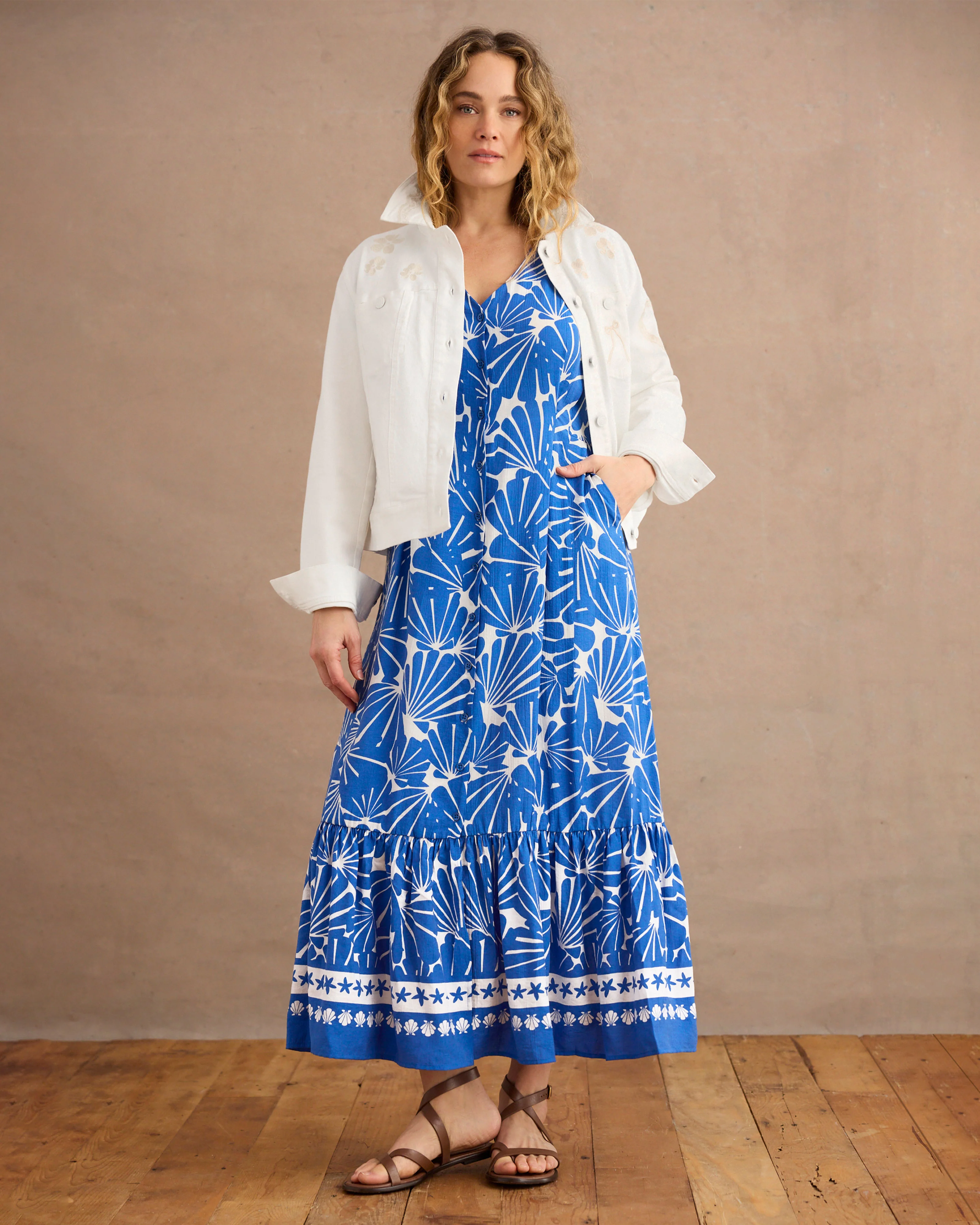 Make a splash in this bold shell-print maxi with nautical border hem. The Dune Dress has a V-neck and inverted pleat detailing at the waist to flatter every figure while back shirring and pockets keep it breezy and effortless. Perfect with either sandals or sneakers, our shell print dress is resort style made easy.