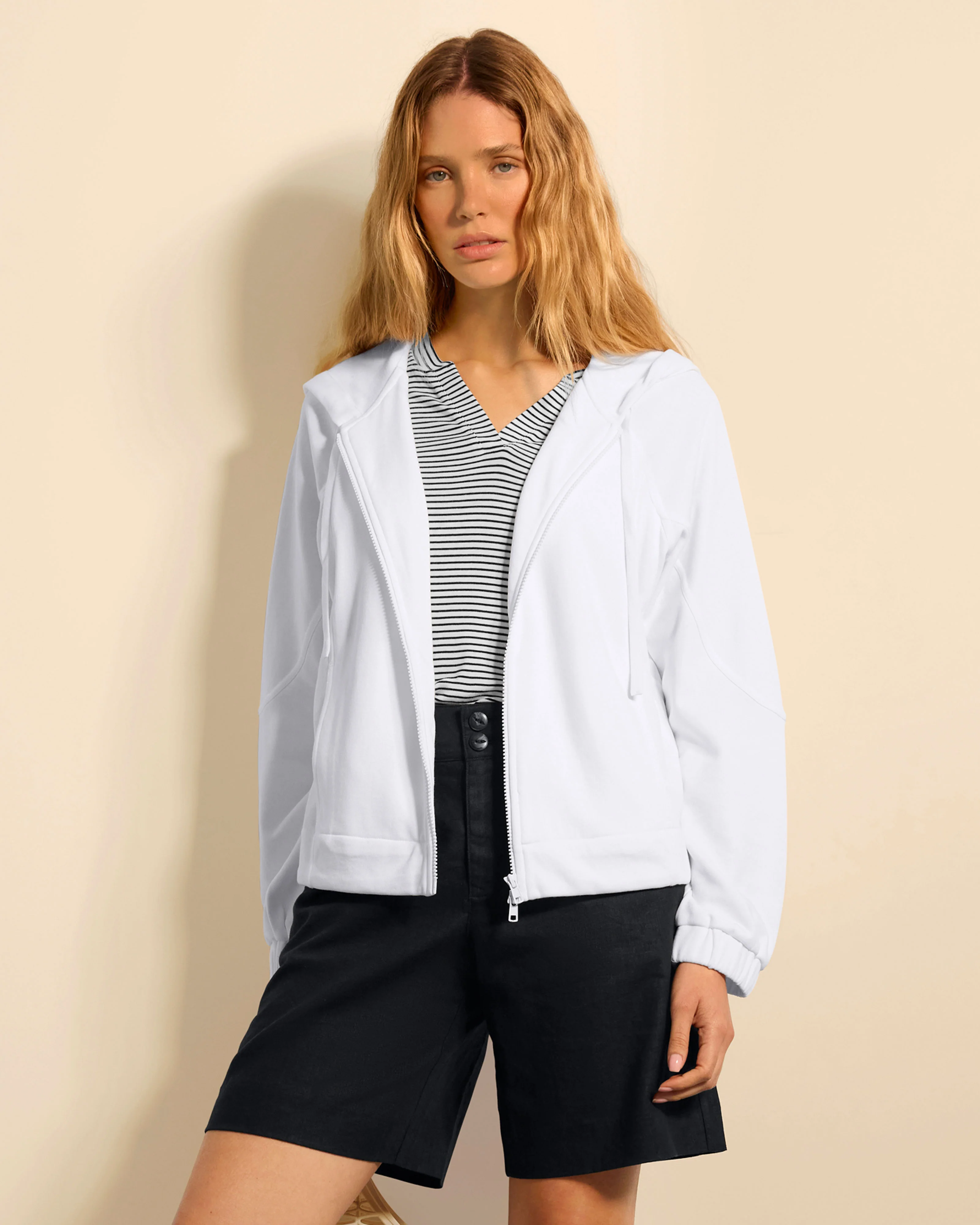 You will love our women's white hoodie. The white Fair Play Hoodie is equal parts sporty and stylish. Designed for a relaxed fit with two-way front zipper and a drawstring hood, it delivers effortless versatility. Inseam pockets and elastic cuffs keep the look streamlined, while the inside drawcord lets you cinch the waist for an on-trend bubble silhouette.