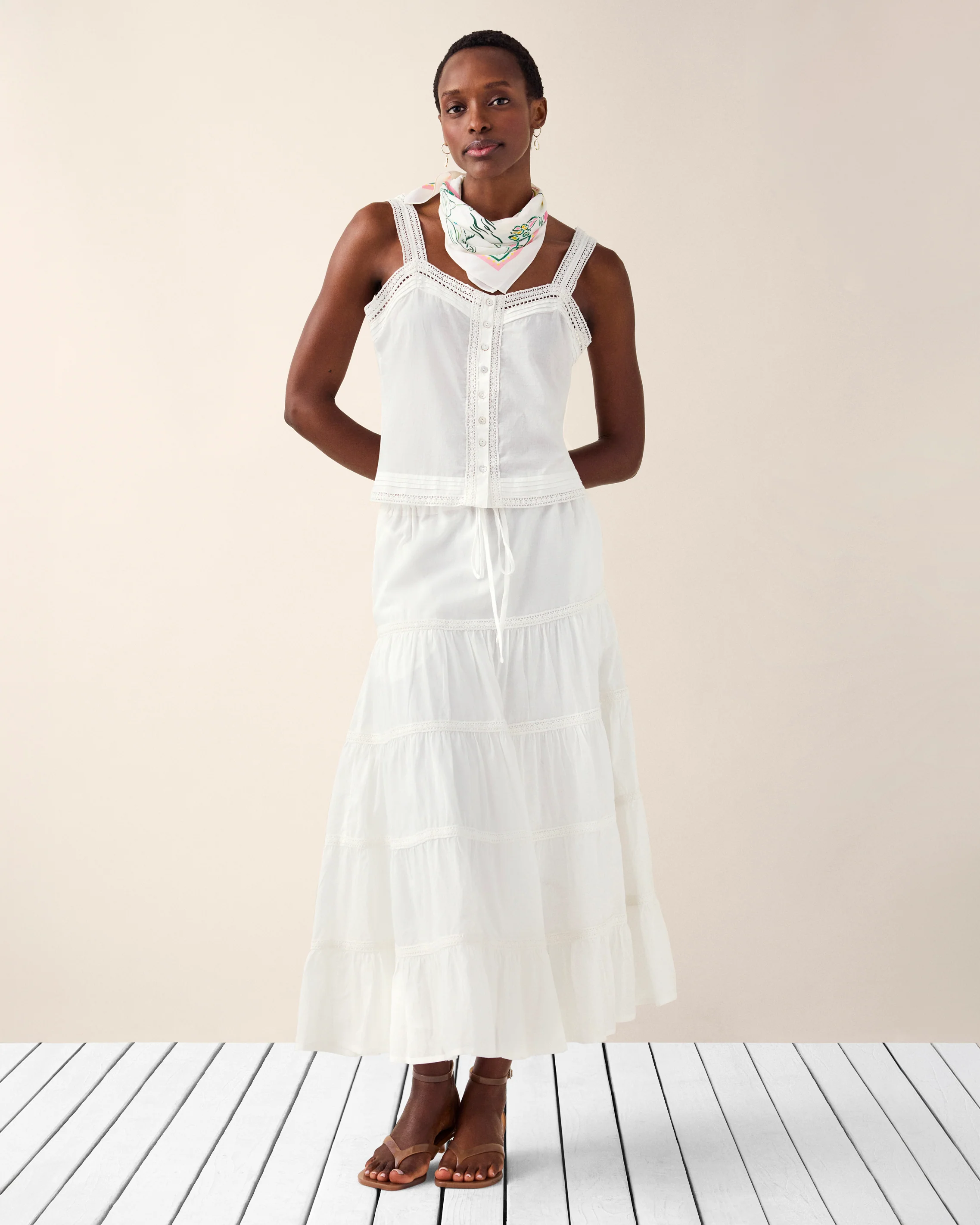 Designed in a lightweight cotton with full lining and an adjustable waist for ease, the Ingenue Skirt is perfect to wear in the warmer months. Tiered crochet detailing adds a sweetness to this versatile skirt. Shop our white cotton maxi skirt today.