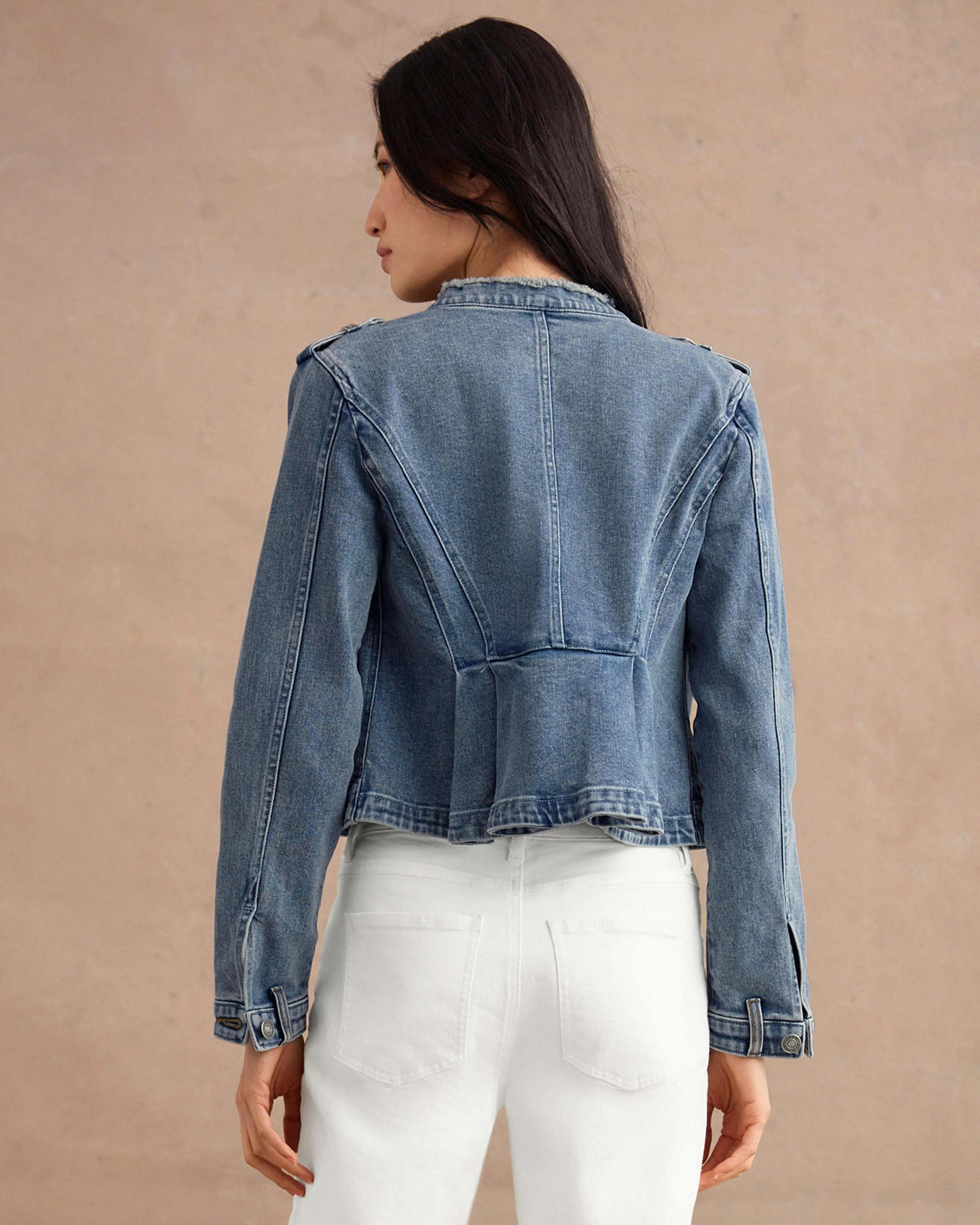 A slim-fit denim jacket with designer details and plenty of stretch. The Jeanie Jacket features a frayed collar detailing, cabi jean-tack buttons, shoulder epaulets, and flap pockets. Back princess seams open to a playful peplum that’s unique and feminine. It’s couture craftsmanship with cool-girl edge. Shop our women's denim jacket today.