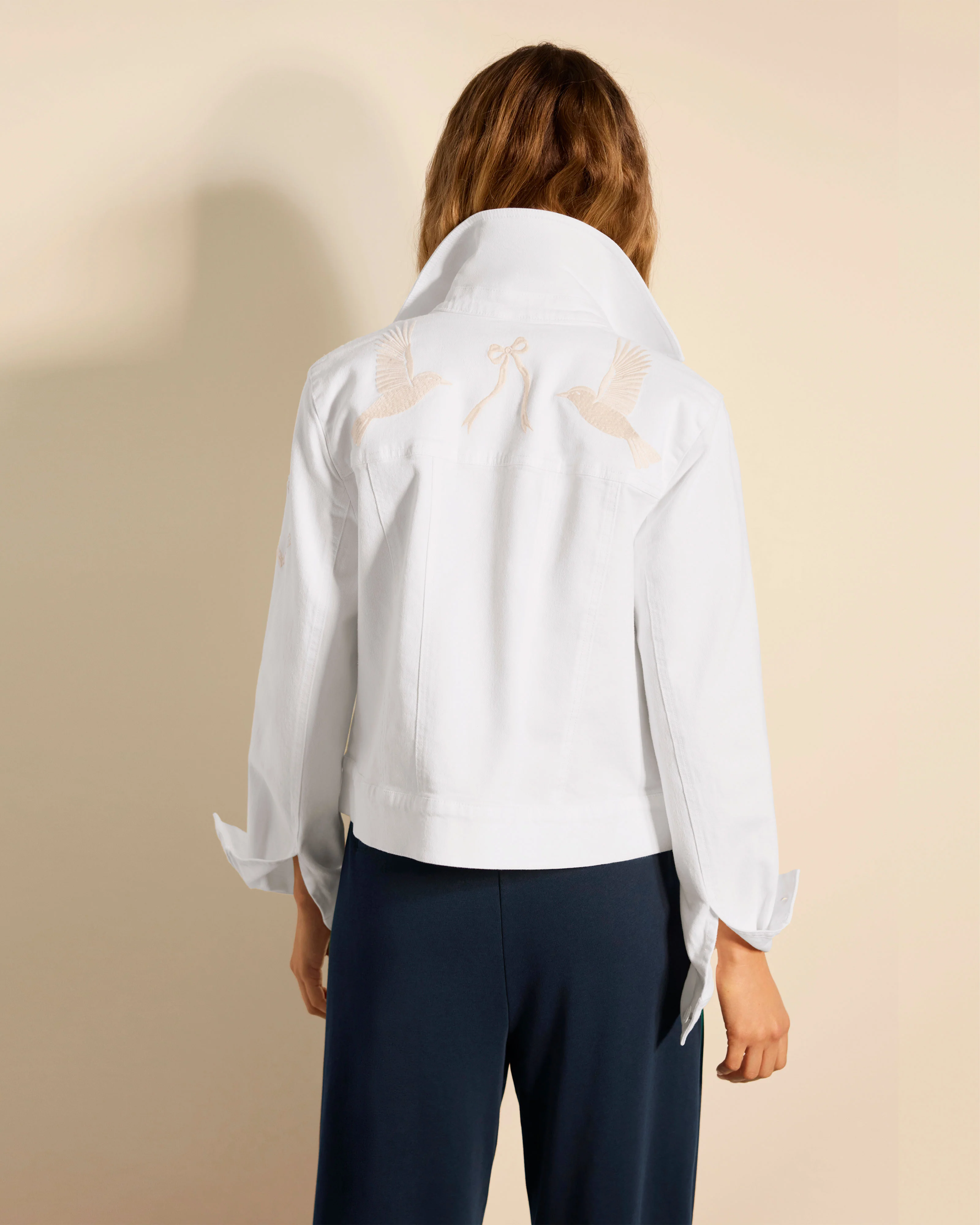 Whether you’re running weekend errands or meeting friends for brunch, the Ladybird Jacket pairs effortlessly with everything. Made from the same fabric as the Lark and Marina Jeans, it features a subtle embroidery of hearts, flowers, and bows for a feminine touch. The white-out jean-tack closures and back yoke adds personality, while light tonal stitching keeps it versatile and easy to wear. Shop our women's white denim jacket today.