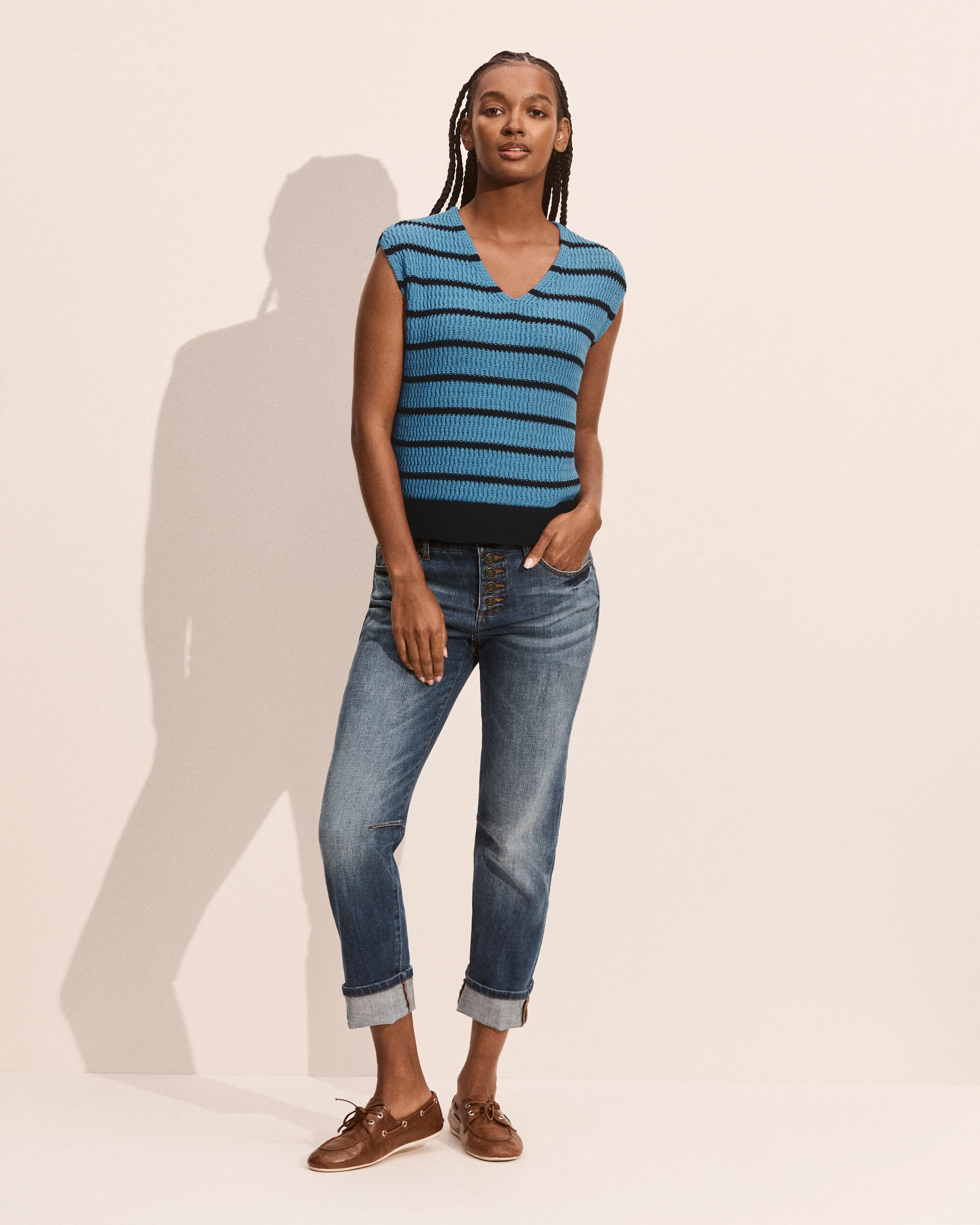 The Match Point Sweater delivers sporty sensibility with classic blue and navy stripes across a relaxed silhouette. The V-neckline and cap sleeves keep it effortless. Lightweight with just enough structure, the sweater is the perfect warm-weather knit for your next casual outing. Pair our striped cap sleeve sweater with the Easy Skirt or Sloane Jean for a clean, modern finish.
