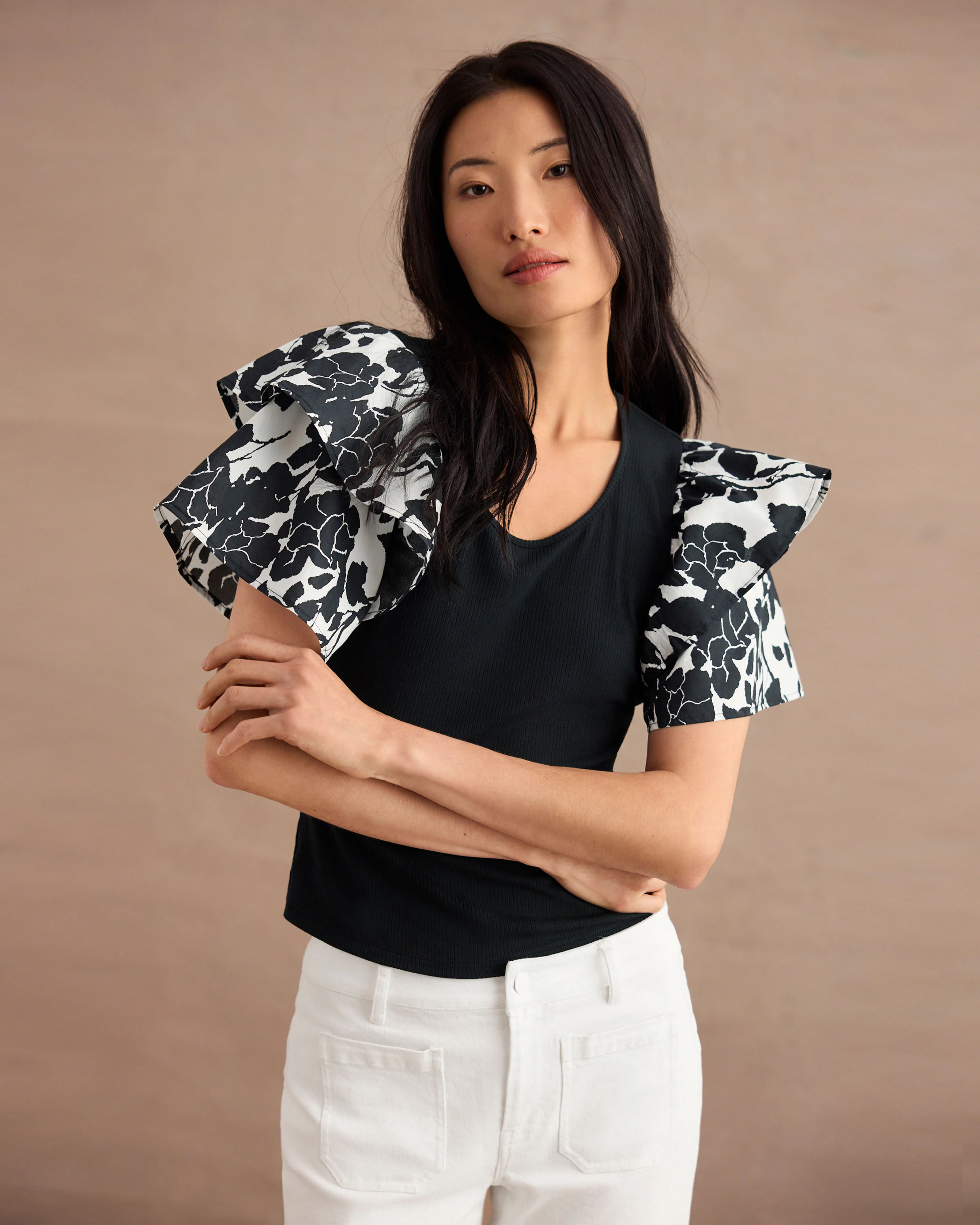 Make a statement effortlessly in this close-to-the-body tee. The Opera Tee is designed with double-layer ruffle sleeves in a vibrant black and white floral print. Full of playful femininity and just the right amount of drama, it transforms a simple silhouette into a show-stopping look—perfect for pairing with jeans or skirts that let the sleeves steal the show. Shop our black floral ruffle sleeve top today.