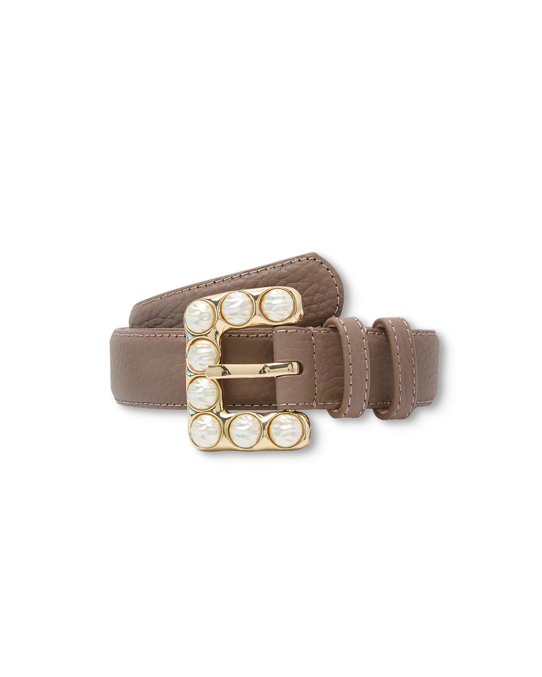 The Oyster Bay Belt finishes any outfit with style–especially in this trending narrower width. Done in a taupe textured leather, our women's taupe leather belt is finished with beautiful pearl details on a gold buckle base to pair with jeans, trousers, or your favorite dress.