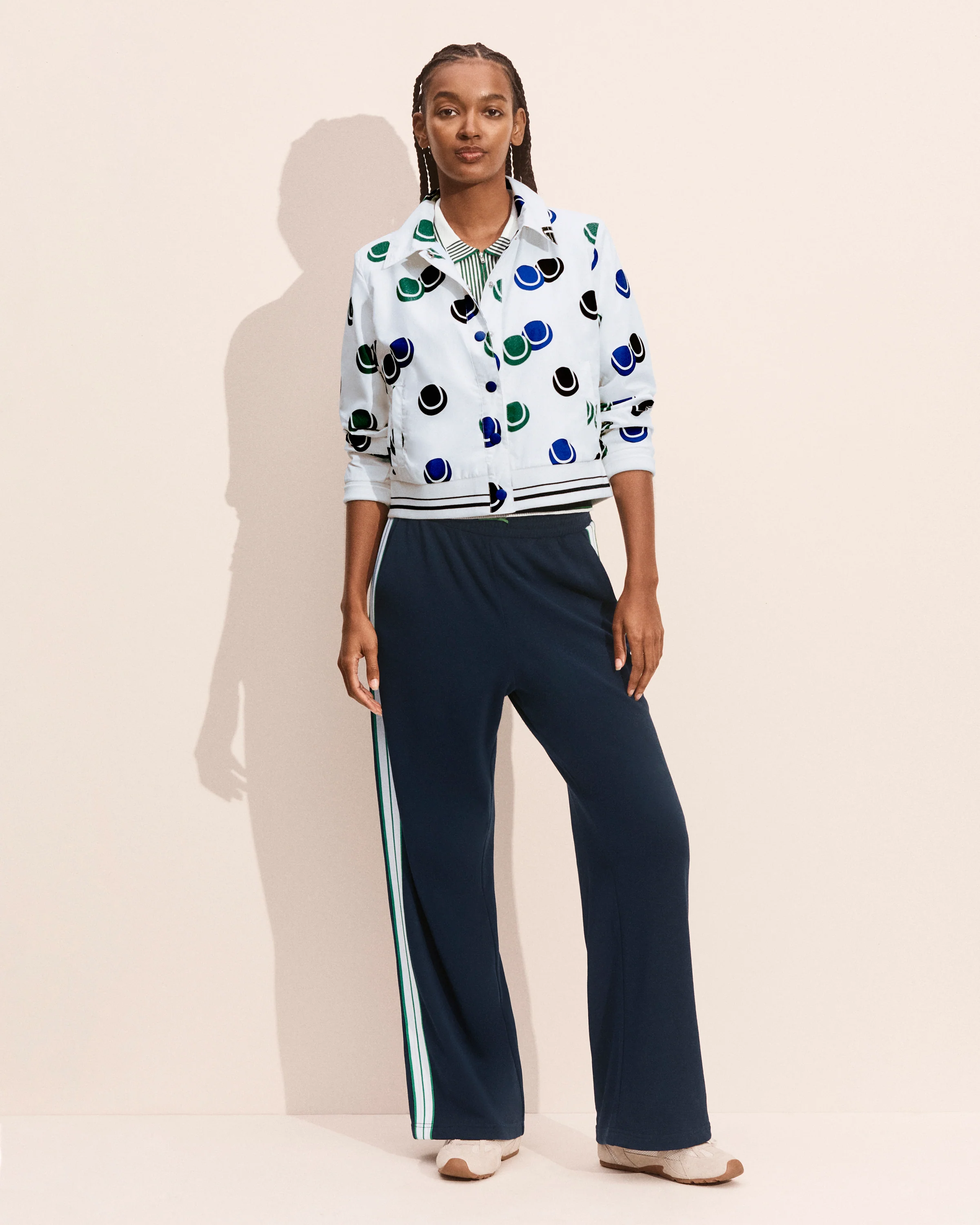 The Rally Jacket channels sporty charm with an effortless, polished edge. Its conversational allover print adds a playful twist to the relaxed woven silhouette, while a classic collar, snap front, and navy-striped rib trim complete the look. Fully lined, this women's active jacket is the layer that pulls everything together. Pair it with the Trixie Track Pant for a modern, coordinated look.