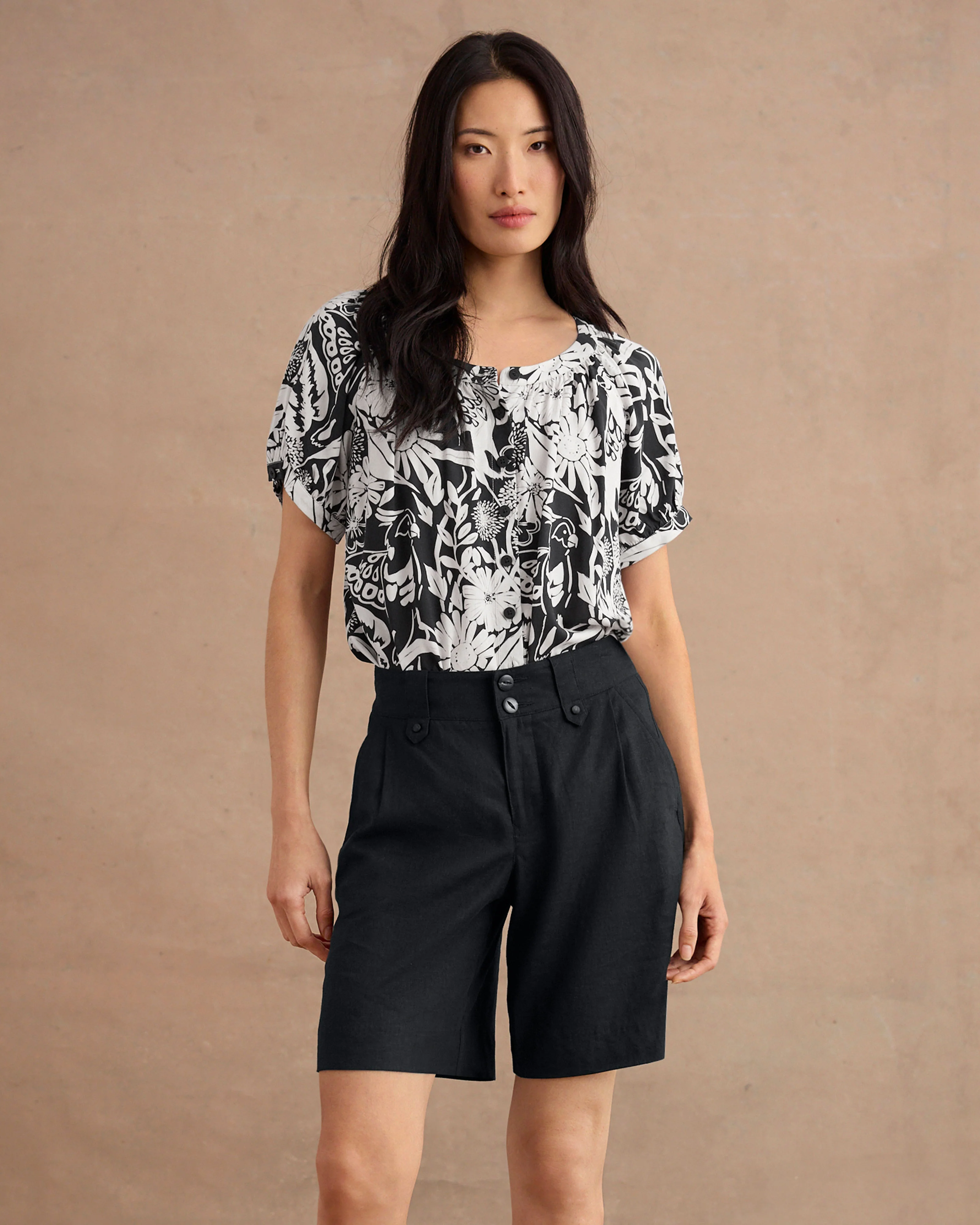 The Rio Blouse brings effortless charm to any outfit. With its relaxed fit and oversized floral print, this top makes a statement in the right ways and easily pairs with trousers for work or light denim for the weekend. our black floral blouse is a banded scoop neck and button front keep it versatile as a go-to top for instant polish with a playful twist.