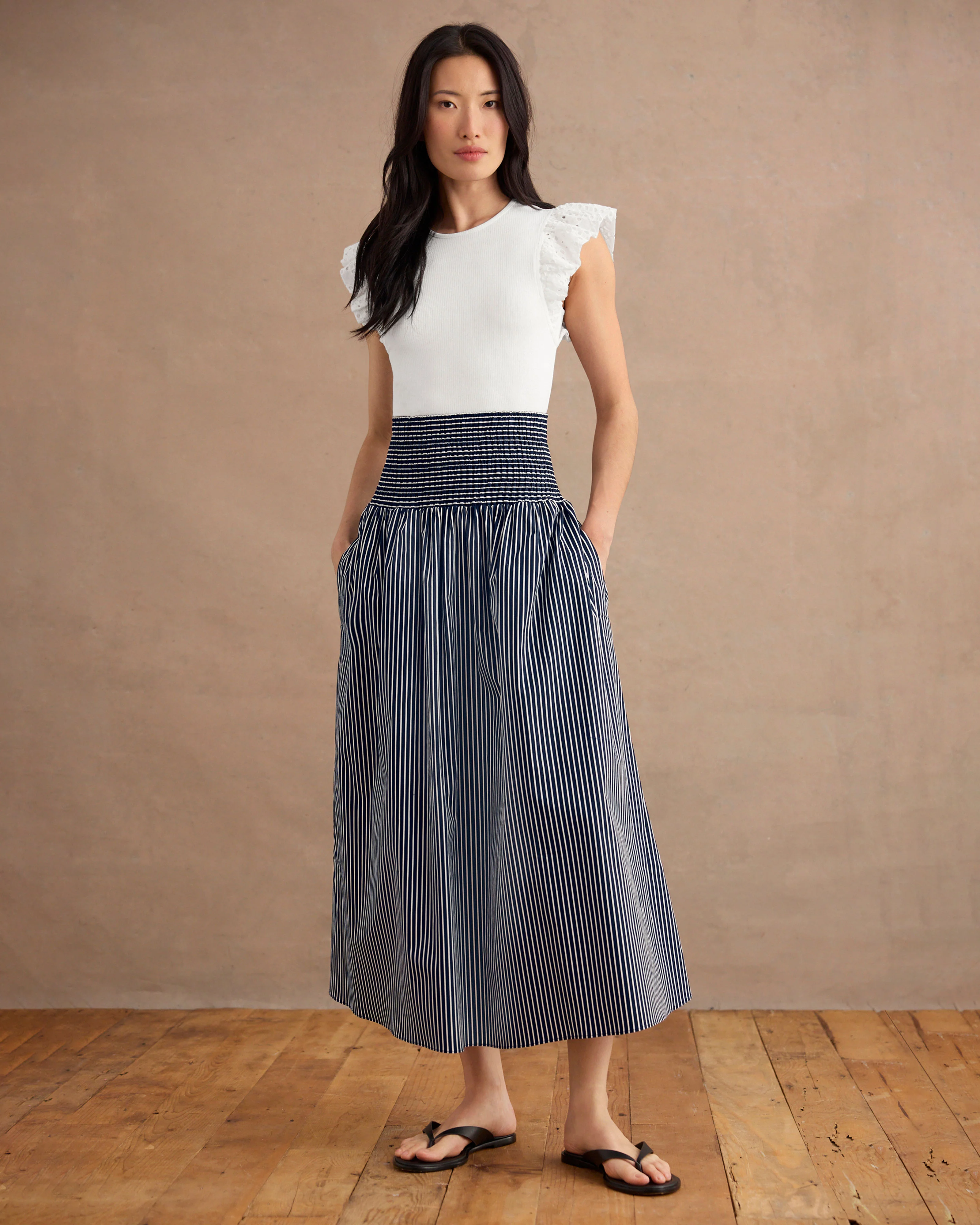 The Scooter Skirt is where classic meets feminine flair. The smocked waistband flatters while the full A-line silhouette moves with ease. In a timeless navy and white stripe, this striped maxi skirt is a polished yet relaxed piece that can transition seamlessly from day to night.