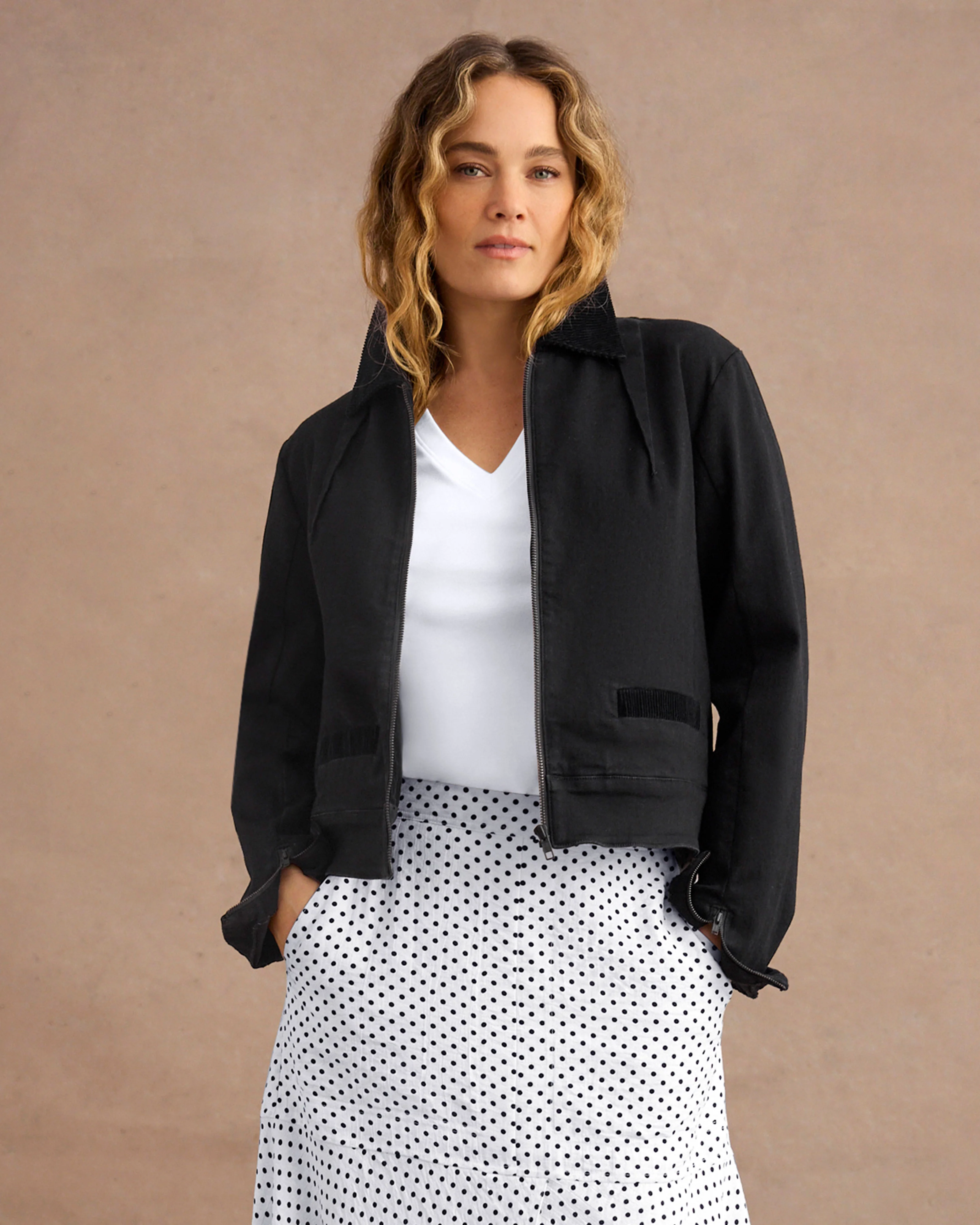 Fall in love with our women's moto jacket.The Shrunken Moto Jacket brings a modern edge to your wardrobe with its slim-fitting silhouette and stealthy stretch. Corduroy details and matte black zips add a touch of texture that is perfect over fitted dresses for date nights or with tailored trousers for a workday statement.