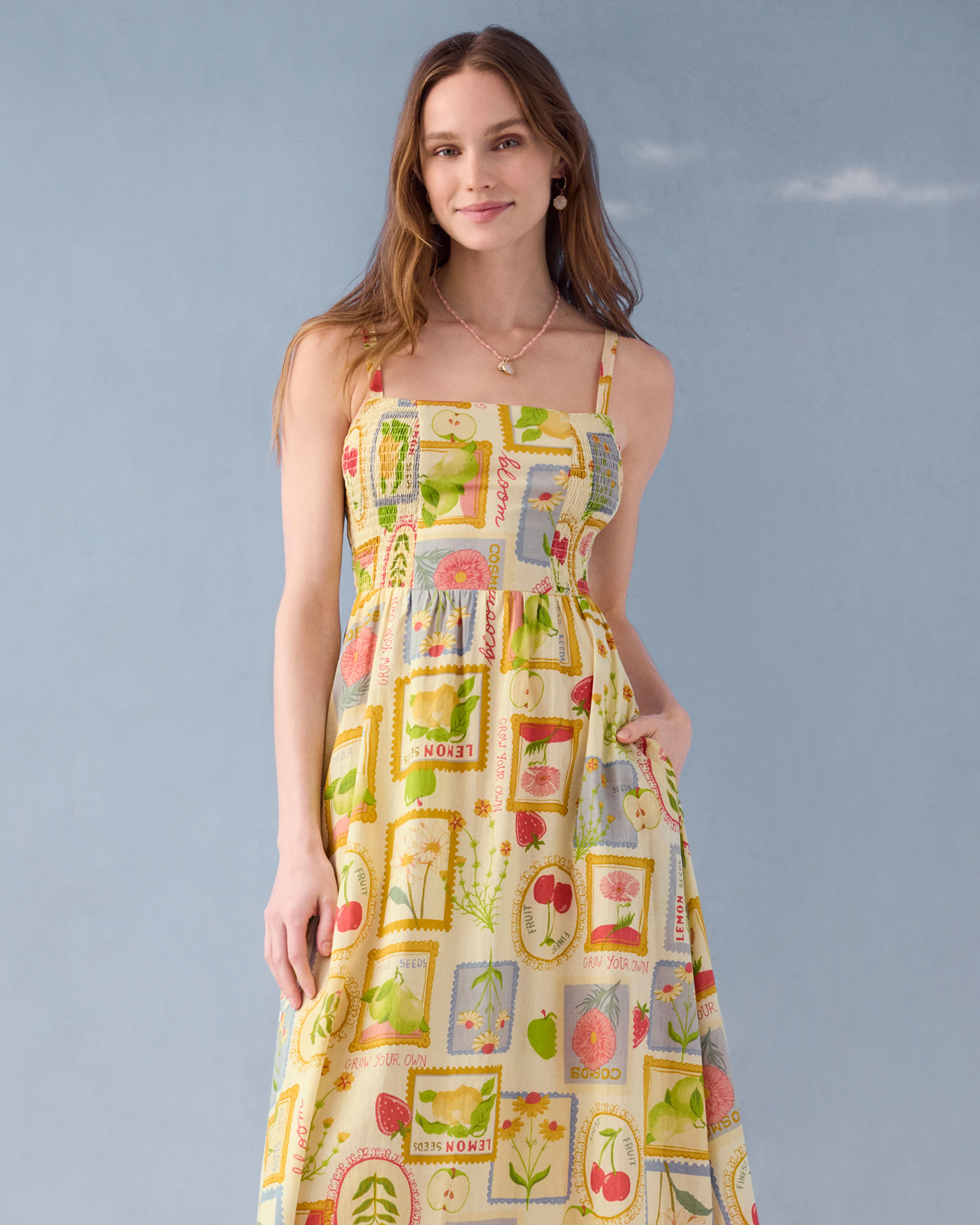 The Sophia Dress features a retro, garden-inspired print that welcomes spring in sunny, yellow hues. This yellow midi dress is fully lined with a fitted, elastic-shirred bodice for comfortable wear. Crafted in 100% cotton with a midi length, it’s an easy choice for brunch, baby showers, or spring date nights.