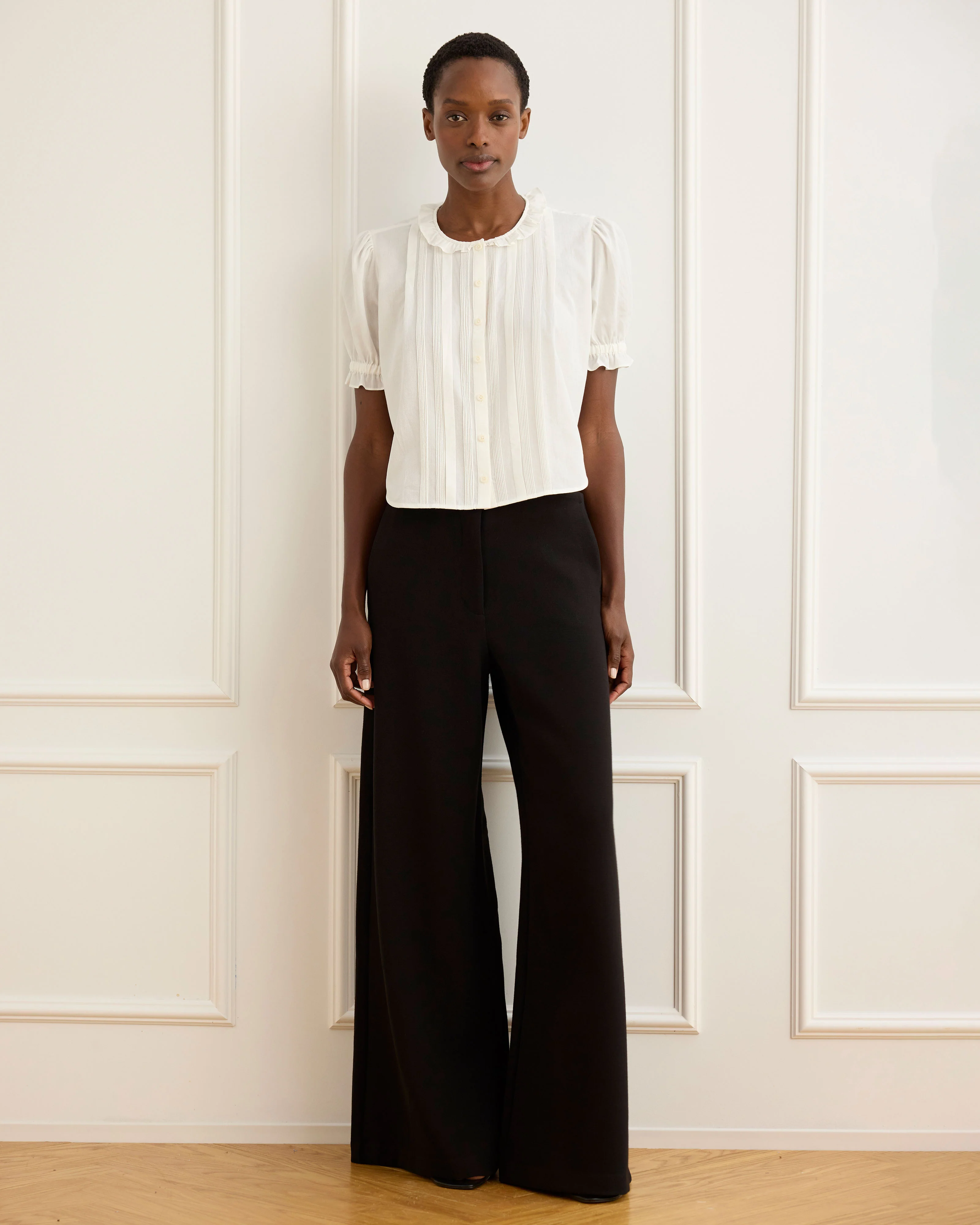 The black Toni Trouser never goes out of style. The ultra high-rise waist and wide leg makes you feel confident. Fixed with a zipper and double hook-and-bar closure, pair this trouser with the matching jacket or a silk top to instantly polish the look. These black wide leg trousers are a must in your rotation.