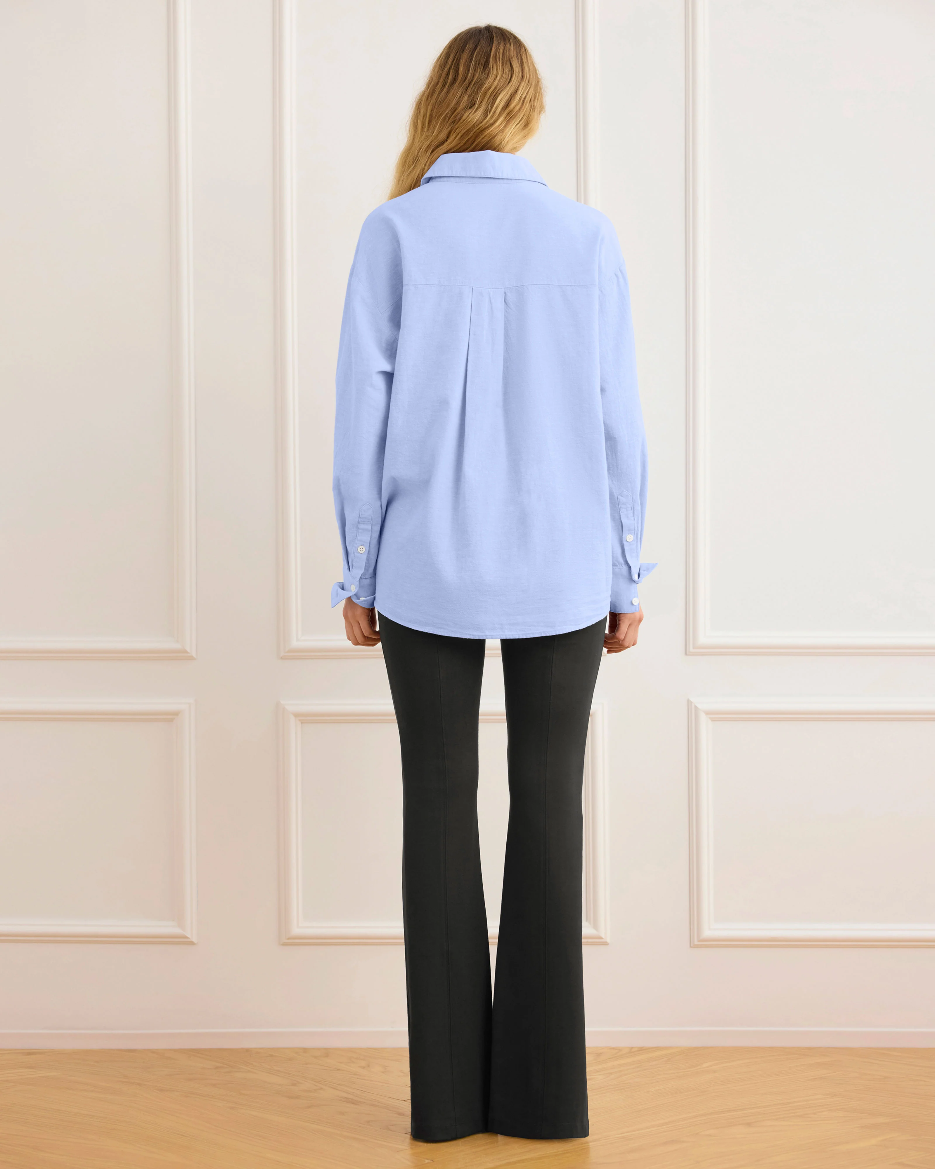 The Tuxedo Flegging in black features a high-rise fit with a subtle bootcut leg and front leg slit. Tuxedo-inspired side seams and back pockets elevate these flared leggings beyond casual wear.